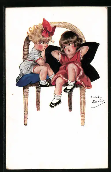 Künstler-AK Chicky Spark: Zwei niedliche Mädchen auf einem Stuhl