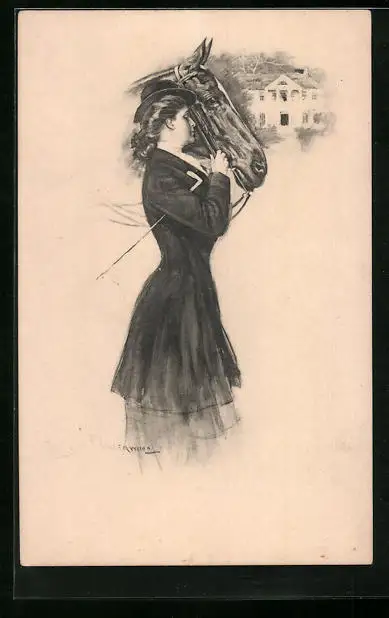 Künstler-AK Clarence F. Underwood: Reiterin mit ihrem Pferd