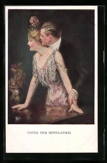 Künstler-AK Clarence F.Underwood: Frau steht unter dem Mistelzweig