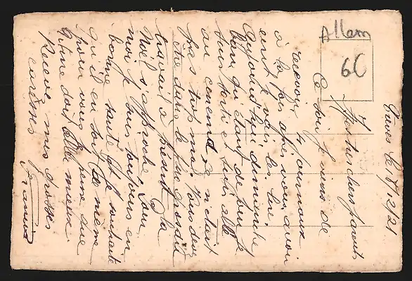 Personenbezogene Daten auf der Rückseite der Karte wurden durch blauen Textmarker unkenntlich gemacht. Die blauen Stellen sind auf die Vorderseite durchgeweicht und wirken sich negativ auf das Postkartenfoto aus