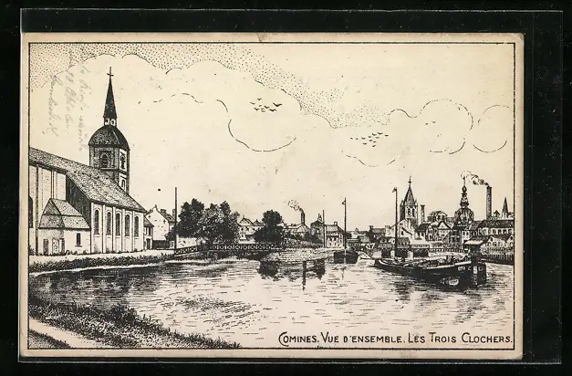 Künstler-AK Comines, Vue d`Ensemble, Les Trois Clochers