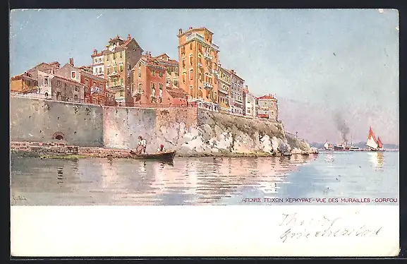 Künstler-AK Corfou, vue des Murailles, Fischer im Ruderboot