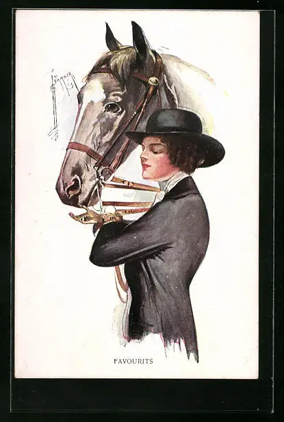 Künstler-AK Court Barber: Favourits, junge Dame in schwarz mit ihrem Pferd