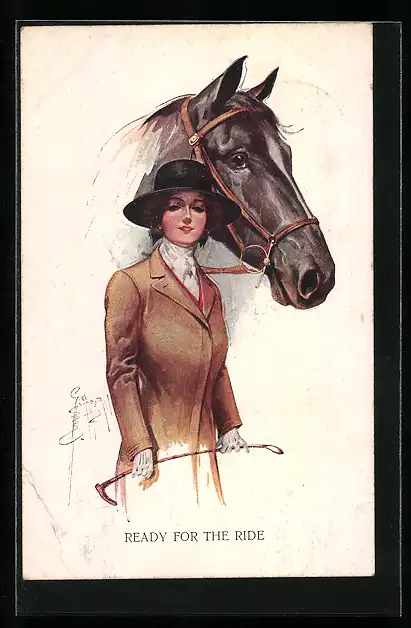Künstler-AK Court Barber: Ready for the ride, Reiterin und Pferd