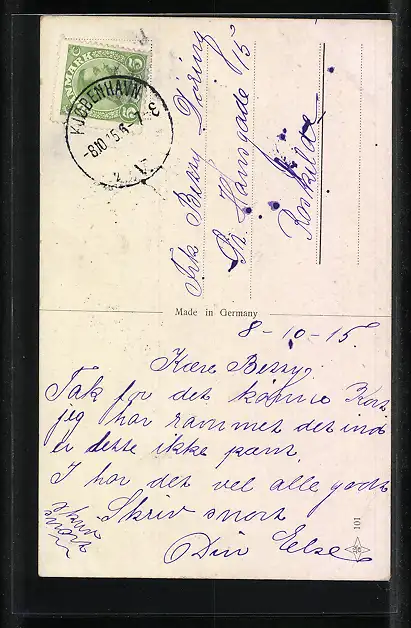 Personenbezogene Daten auf der Rückseite der Karte wurden durch blauen Textmarker unkenntlich gemacht. Die blauen Stellen sind auf die Vorderseite durchgeweicht und wirken sich negativ auf das Postkartenfoto aus