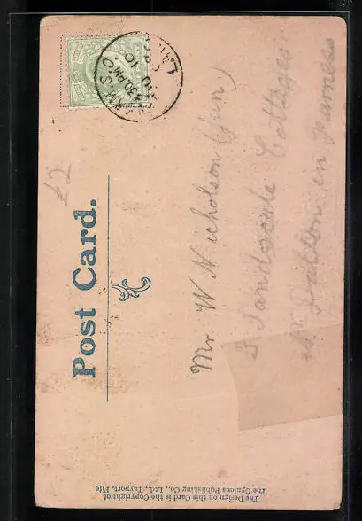Personenbezogene Daten auf der Rückseite der Karte wurden durch blauen Textmarker unkenntlich gemacht. Die blauen Stellen sind auf die Vorderseite durchgeweicht und wirken sich negativ auf das Postkartenfoto aus