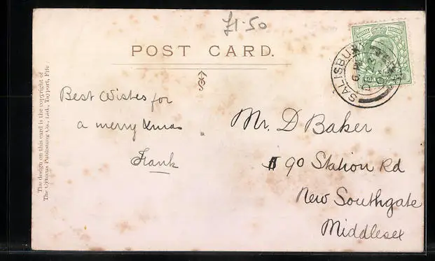 Personenbezogene Daten auf der Rückseite der Karte wurden durch blauen Textmarker unkenntlich gemacht. Die blauen Stellen sind auf die Vorderseite durchgeweicht und wirken sich negativ auf das Postkartenfoto aus