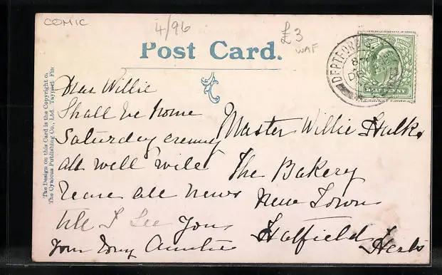 Personenbezogene Daten auf der Rückseite der Karte wurden durch blauen Textmarker unkenntlich gemacht. Die blauen Stellen sind auf die Vorderseite durchgeweicht und wirken sich negativ auf das Postkartenfoto aus