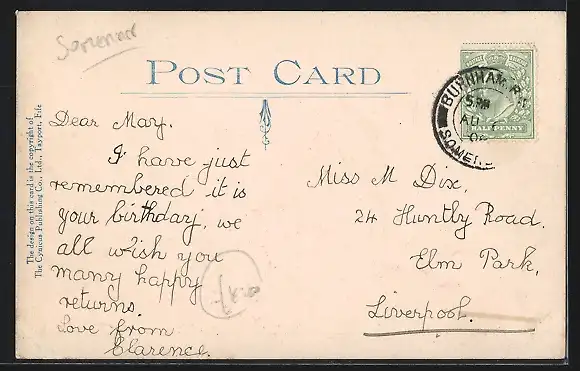 Personenbezogene Daten auf der Rückseite der Karte wurden durch blauen Textmarker unkenntlich gemacht. Die blauen Stellen sind auf die Vorderseite durchgeweicht und wirken sich negativ auf das Postkartenfoto aus