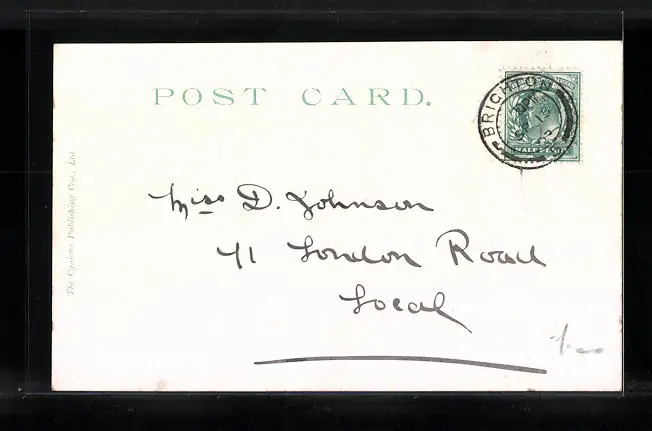Personenbezogene Daten auf der Rückseite der Karte wurden durch blauen Textmarker unkenntlich gemacht. Die blauen Stellen sind auf die Vorderseite durchgeweicht und wirken sich negativ auf das Postkartenfoto aus