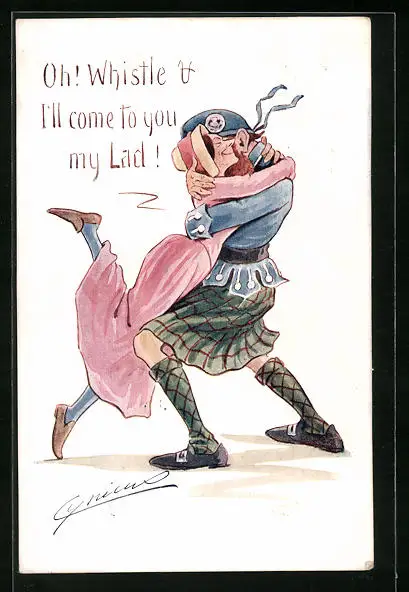Künstler-AK Cynicus: Schotte umarmt seine Liebste