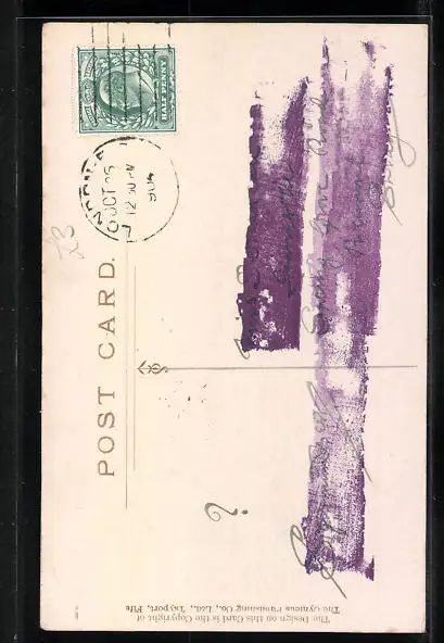Personenbezogene Daten auf der Rückseite der Karte wurden durch blauen Textmarker unkenntlich gemacht. Die blauen Stellen sind auf die Vorderseite durchgeweicht und wirken sich negativ auf das Postkartenfoto aus