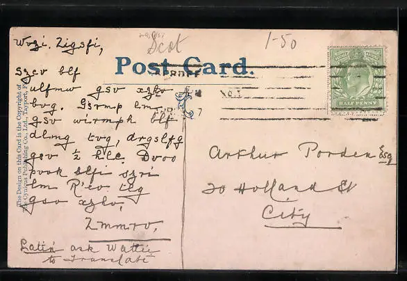 Personenbezogene Daten auf der Rückseite der Karte wurden durch blauen Textmarker unkenntlich gemacht. Die blauen Stellen sind auf die Vorderseite durchgeweicht und wirken sich negativ auf das Postkartenfoto aus
