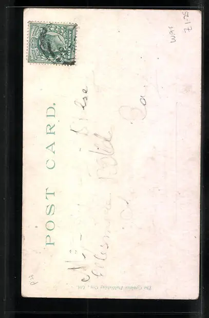 Personenbezogene Daten auf der Rückseite der Karte wurden durch blauen Textmarker unkenntlich gemacht. Die blauen Stellen sind auf die Vorderseite durchgeweicht und wirken sich negativ auf das Postkartenfoto aus