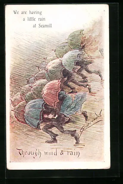 Künstler-AK Cynicus: We are having a little rain at Seamill - Through wind & rain