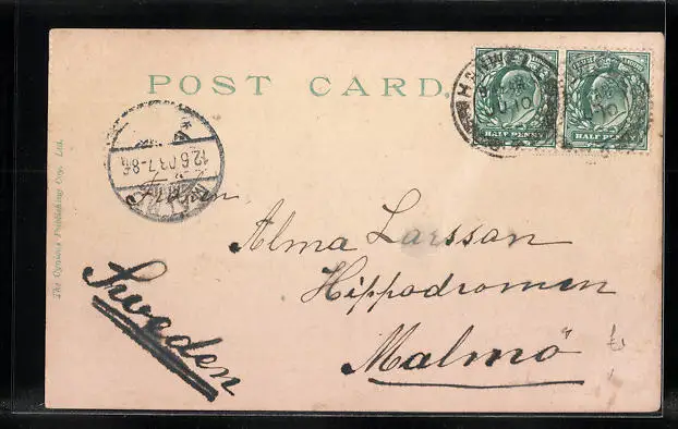 Personenbezogene Daten auf der Rückseite der Karte wurden durch blauen Textmarker unkenntlich gemacht. Die blauen Stellen sind auf die Vorderseite durchgeweicht und wirken sich negativ auf das Postkartenfoto aus