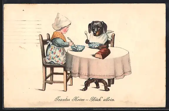 Künstler-AK Dackel und Kind essen zusammen am Tisch