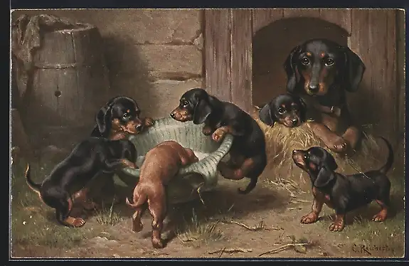 Künstler-AK Dackelhündin mit ihren Welpen