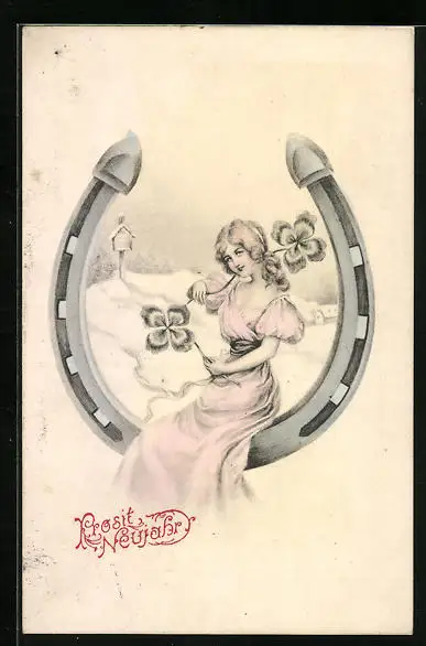 Künstler-AK Dame im Kleid mit Hufeisen und Kleeblättern, Prosit Neujahr