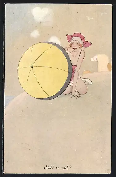 Künstler-AK Dame in Badeanzug hinter einem Schirm