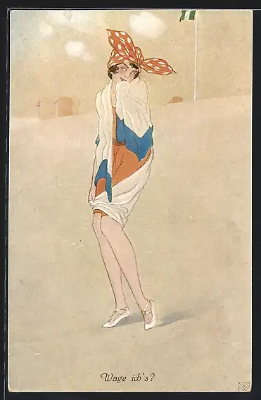 Künstler-AK Dame in Badeanzug mit Handtuch