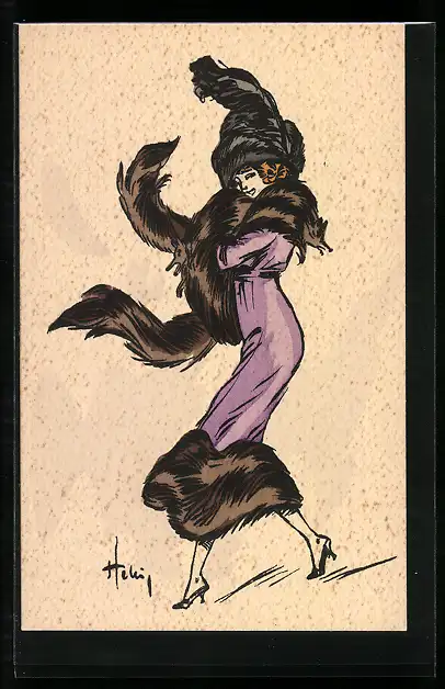 Künstler-AK Dame in violettem Mantel mit Pelz