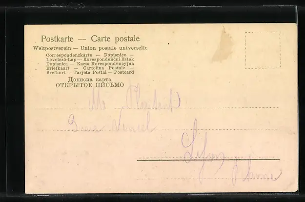 Personenbezogene Daten auf der Rückseite der Karte wurden durch blauen Textmarker unkenntlich gemacht. Die blauen Stellen sind auf die Vorderseite durchgeweicht und wirken sich negativ auf das Postkartenfoto aus