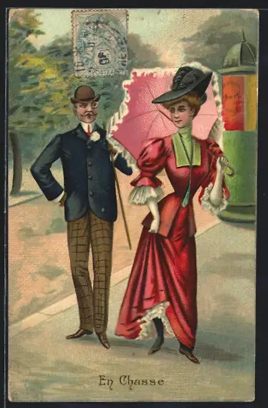Künstler-AK Dame mit Schirm und Herr mit Spazierstock