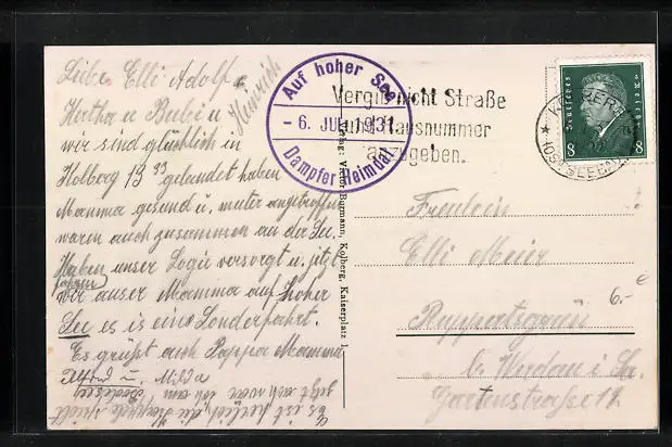 Personenbezogene Daten auf der Rückseite der Karte wurden durch blauen Textmarker unkenntlich gemacht. Die blauen Stellen sind auf die Vorderseite durchgeweicht und wirken sich negativ auf das Postkartenfoto aus