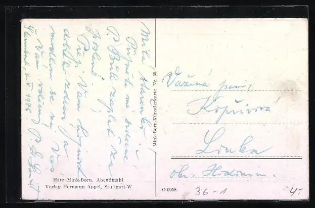 Personenbezogene Daten auf der Rückseite der Karte wurden durch blauen Textmarker unkenntlich gemacht. Die blauen Stellen sind auf die Vorderseite durchgeweicht und wirken sich negativ auf das Postkartenfoto aus