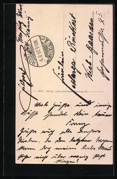 Personenbezogene Daten auf der Rückseite der Karte wurden durch blauen Textmarker unkenntlich gemacht. Die blauen Stellen sind auf die Vorderseite durchgeweicht und wirken sich negativ auf das Postkartenfoto aus