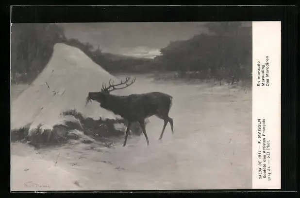 Künstler-AK Das Marodiren, Hirsch an einer winterlichen Futterstelle