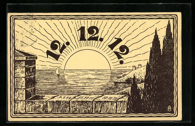 Künstler-AK Datum 12.12.12 über untergehender Sonne