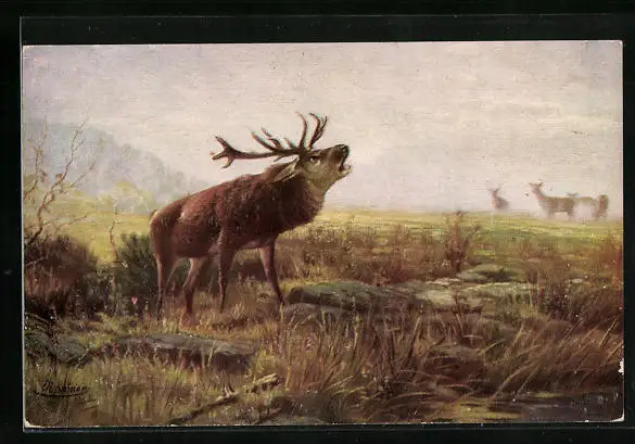 Künstler-AK Degi Nr. 1210: Oktobermorgen, Röhrender Hirsch, Ölgemälde-Imitations-AK