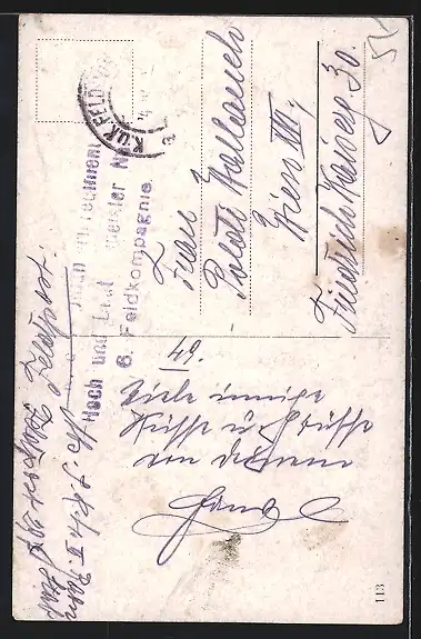 Personenbezogene Daten auf der Rückseite der Karte wurden durch blauen Textmarker unkenntlich gemacht. Die blauen Stellen sind auf die Vorderseite durchgeweicht und wirken sich negativ auf das Postkartenfoto aus
