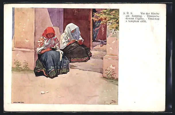 Künstler-AK Detva, Zwei Slovakinnen vor der Kirche