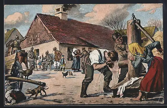 Künstler-AK Deutsche Soldaten bei Morgentoilette in Serbien