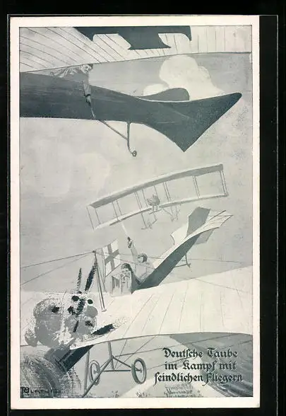 Künstler-AK Deutsche Taube im Luftkampf mit englischem Flugzeug
