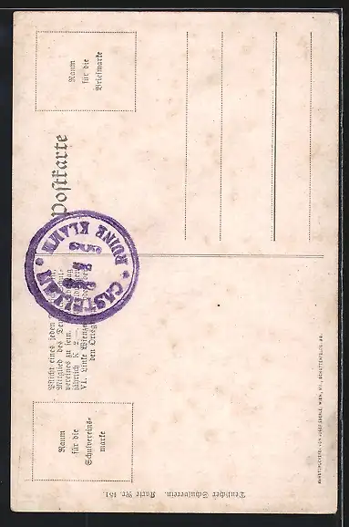 Personenbezogene Daten auf der Rückseite der Karte wurden durch blauen Textmarker unkenntlich gemacht. Die blauen Stellen sind auf die Vorderseite durchgeweicht und wirken sich negativ auf das Postkartenfoto aus