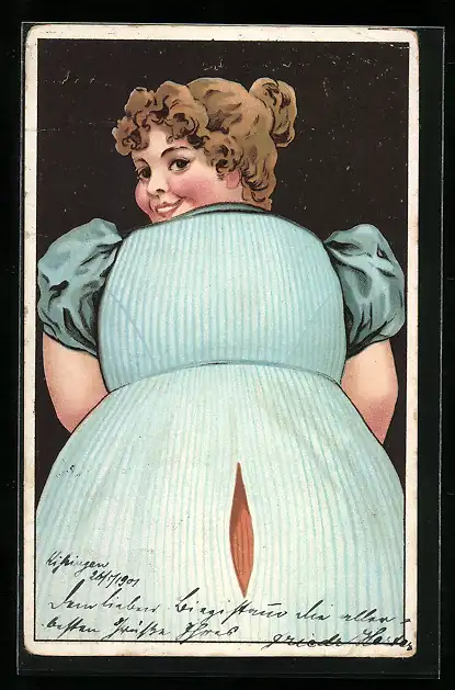 Künstler-AK Dicke Dame mit Riss im Kleid