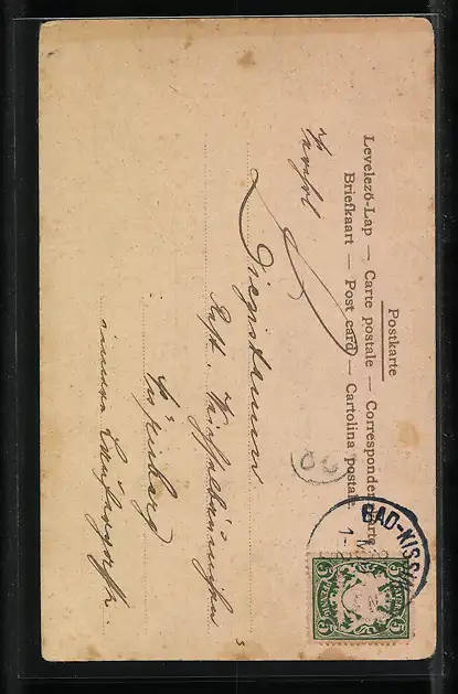 Personenbezogene Daten auf der Rückseite der Karte wurden durch blauen Textmarker unkenntlich gemacht. Die blauen Stellen sind auf die Vorderseite durchgeweicht und wirken sich negativ auf das Postkartenfoto aus