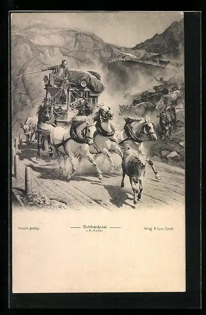 Künstler-AK Die Gotthardpost-Kutsche in voller Fahrt