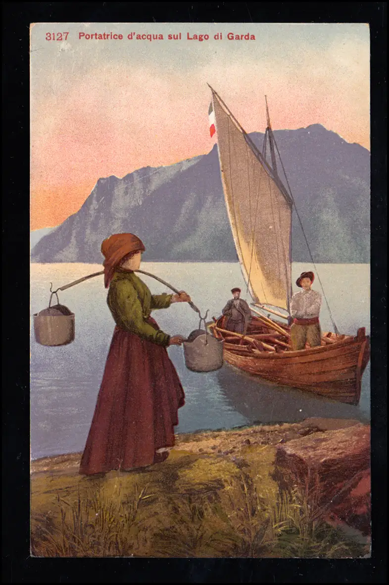 Künstler-AK Die Wasserträgerin am Gardasee mit Fischerboot, ungebraucht