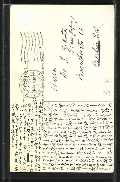 Personenbezogene Daten auf der Rückseite der Karte wurden durch blauen Textmarker unkenntlich gemacht. Die blauen Stellen sind auf die Vorderseite durchgeweicht und wirken sich negativ auf das Postkartenfoto aus