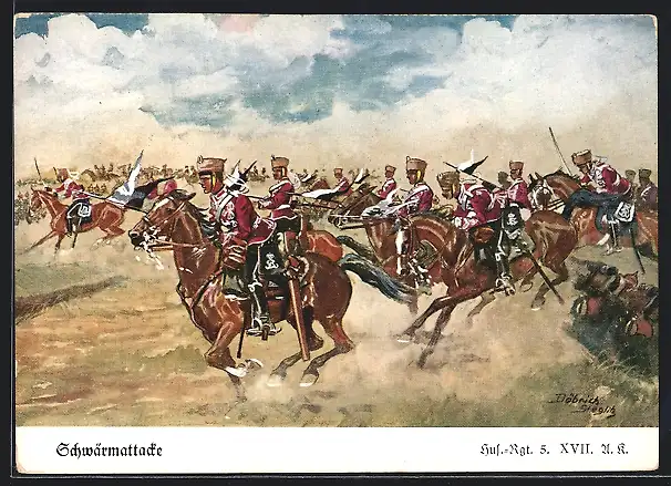 Künstler-AK Döbrich-Steglitz: Schwärmattacke, Husaren-Regiment 5. XVII