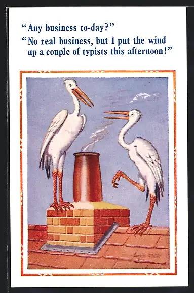Künstler-AK Donald McGill: Any business to-day?..., Storche auf Dach