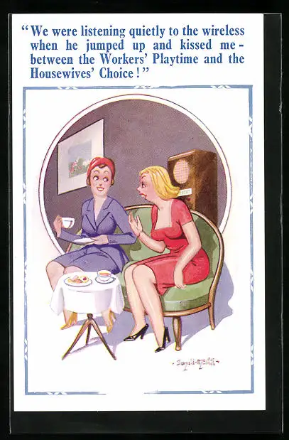 Künstler-AK Donald McGill: Between the Worker`s Playtime and the Housewives` Choice