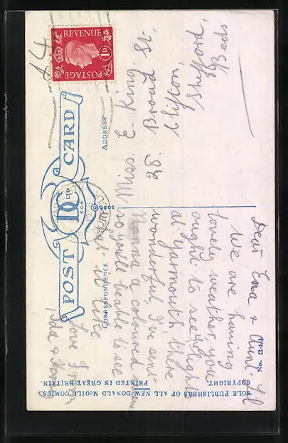 Personenbezogene Daten auf der Rückseite der Karte wurden durch blauen Textmarker unkenntlich gemacht. Die blauen Stellen sind auf die Vorderseite durchgeweicht und wirken sich negativ auf das Postkartenfoto aus