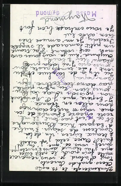 Personenbezogene Daten auf der Rückseite der Karte wurden durch blauen Textmarker unkenntlich gemacht. Die blauen Stellen sind auf die Vorderseite durchgeweicht und wirken sich negativ auf das Postkartenfoto aus