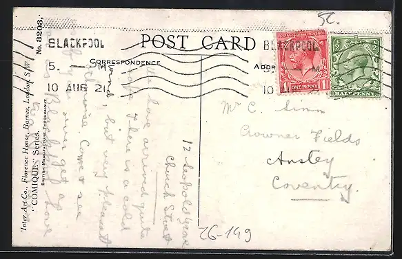 Personenbezogene Daten auf der Rückseite der Karte wurden durch blauen Textmarker unkenntlich gemacht. Die blauen Stellen sind auf die Vorderseite durchgeweicht und wirken sich negativ auf das Postkartenfoto aus